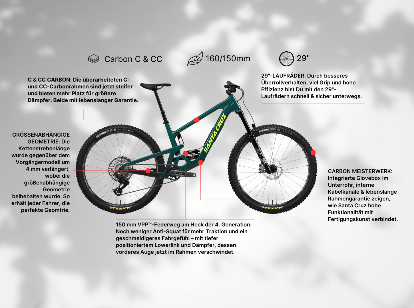 - Große Laufräder bieten bessere Traktion und rollen leichter über Hindernisse, ideal für technische Trails und schnelle Abfahrten.